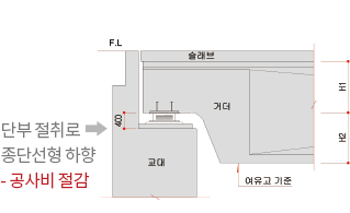 단부거더 절취로 종단 선형 하향 ↓ 성토량 절감 및 편입용지 축소, 여유공간 확보 |
